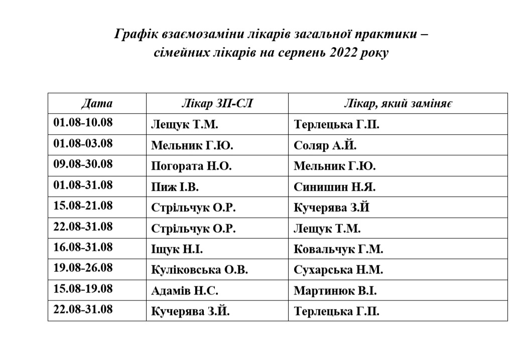 Графік взаємозаміни лікарів на серпень 2022 року