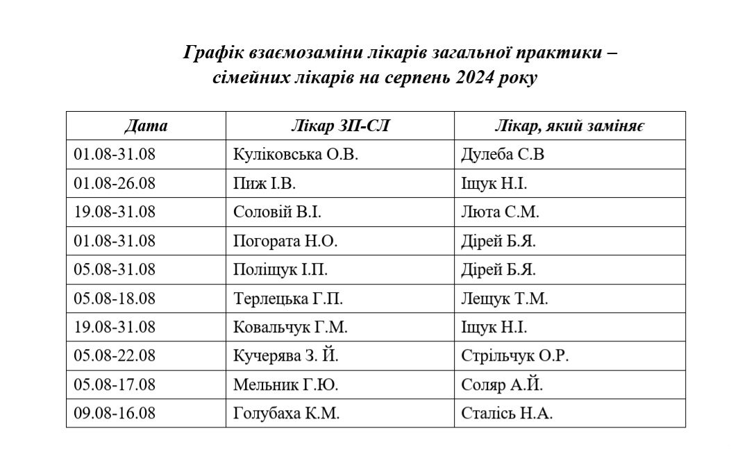 Графік взаємозаміни лікарів на серпень 2024 року