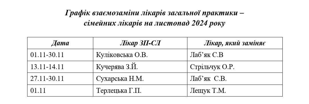 Графік взаємозаміни лікарів на листопад 2024 року