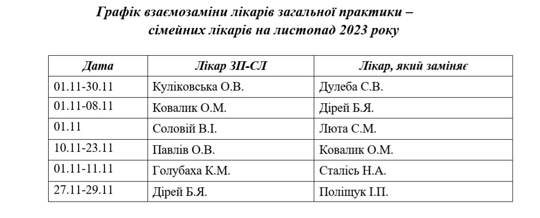 Графік взаємозаміни лікарів ЗПСЛ на листопад 2023