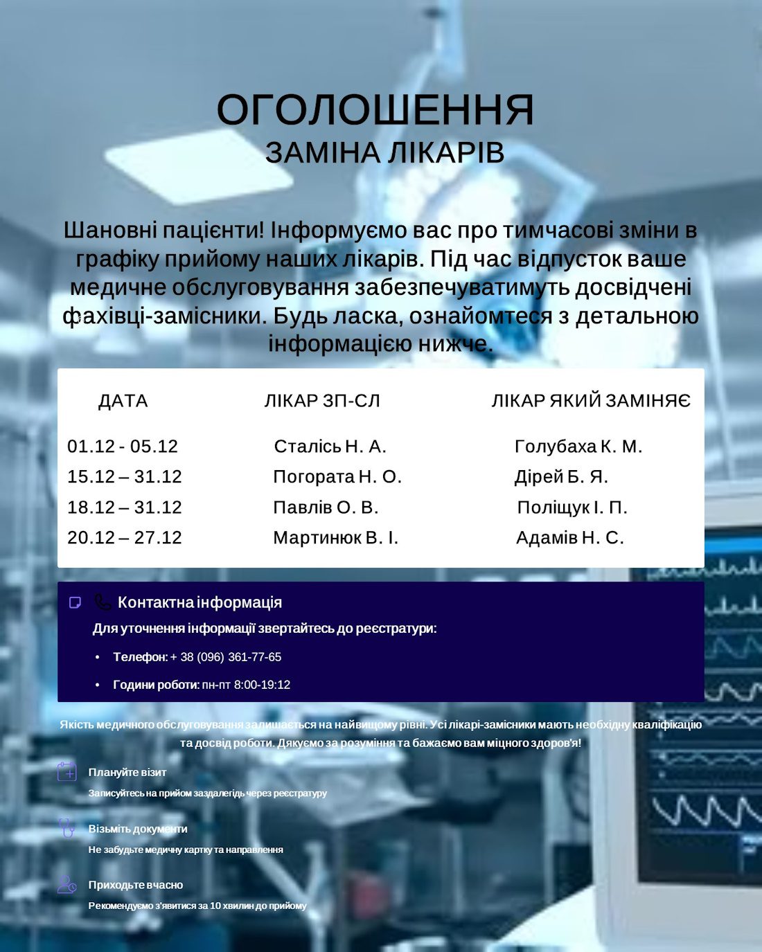 Тимчасова заміна лікарів на грудень 2025